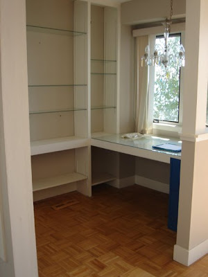 This is where I work. I am amazed that a place that was built in the 70s actually had a small home office. This is on one end of the living/dining area. Cute old chandelier with mismatched prisms is begging for some embellishment. Nice that I don't have to work out of the second bedroom. That means we can have a guest room again.